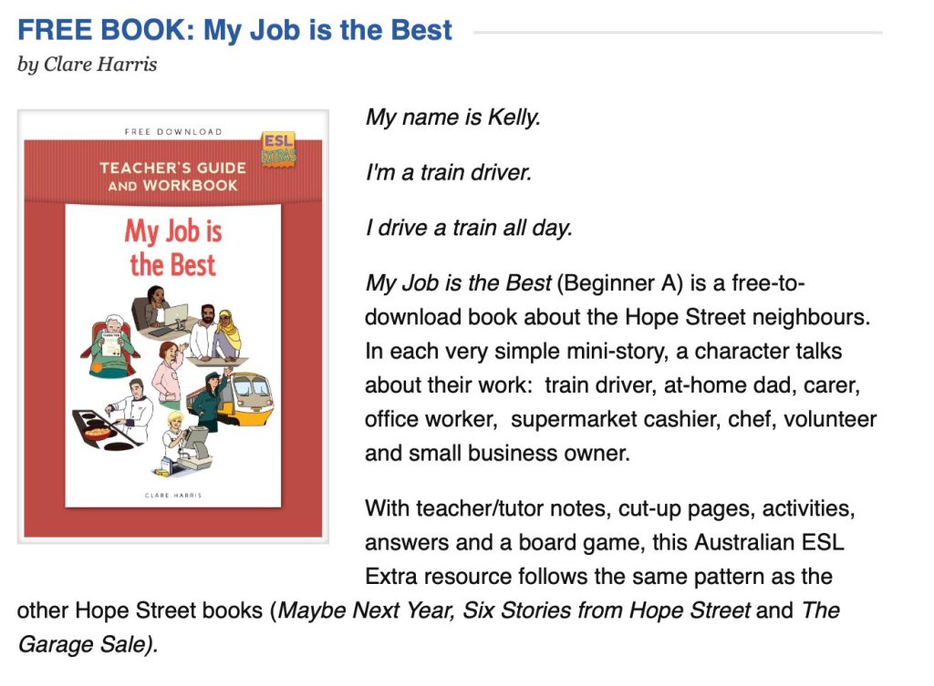 My Job is the Best (by Clare Harris, from The Book Next Door) – like the ESL Extras, with worksheets and teacher notes. Easy beginner or even pre-beginner level.